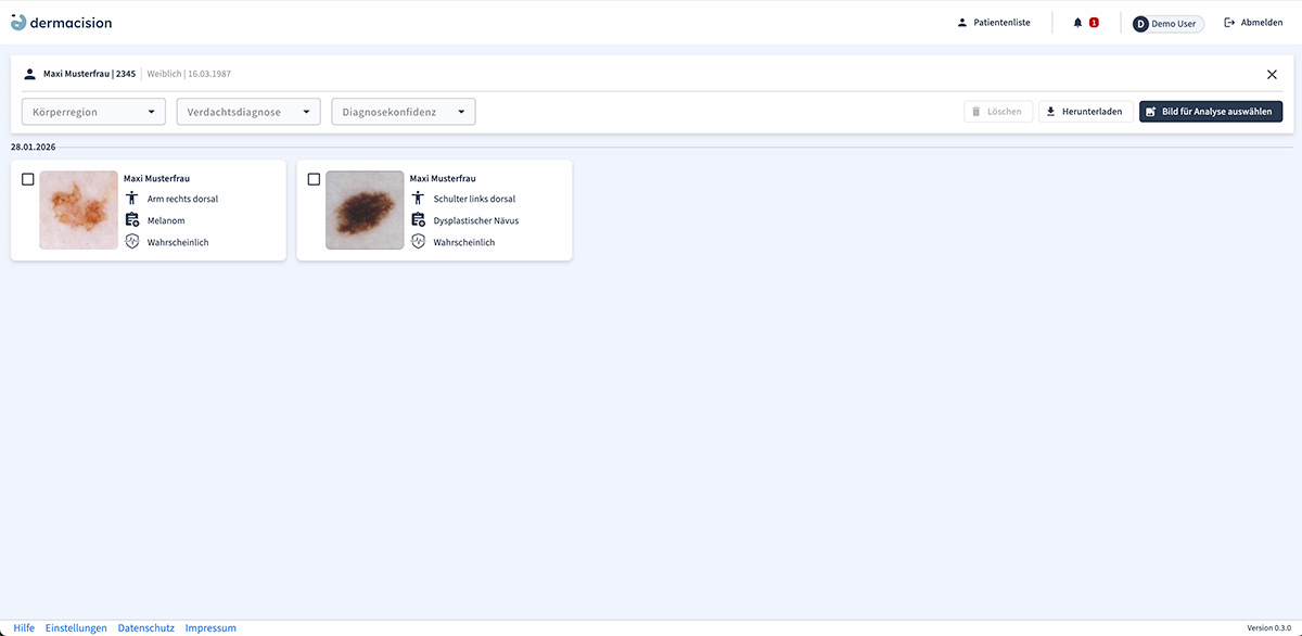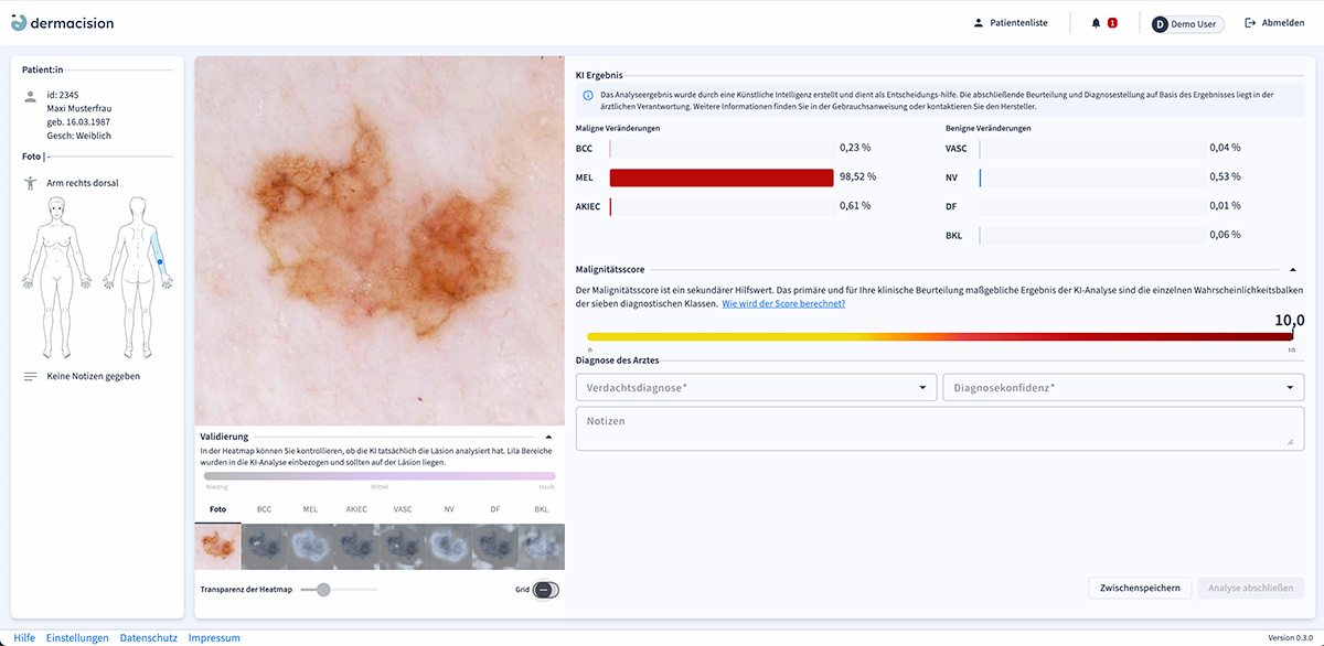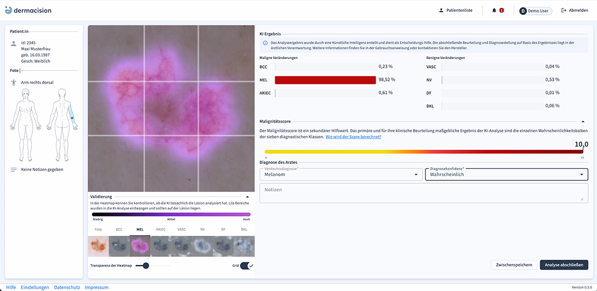 dermacision identifiziert Muster, Anomalien und Auffälligkeiten in den durch intellimago bereitgestellten Bildaufnahmen von Hautläsionen. Die KI-basierte Software wurde mittels einer Vielzahl von dermatologischen Bildern trainiert. Sie bietet Grafiken und Visualisierungen und soll damit die schnelle und präzise Diagnose und Differenzierung von benignen und malignen Hauttumoren sowie Vorstufen unterstützen.